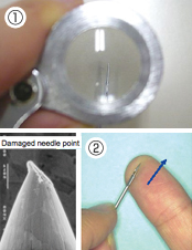 Compare a damaged needle point with a normal one using a loupe and microscope.
